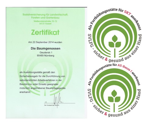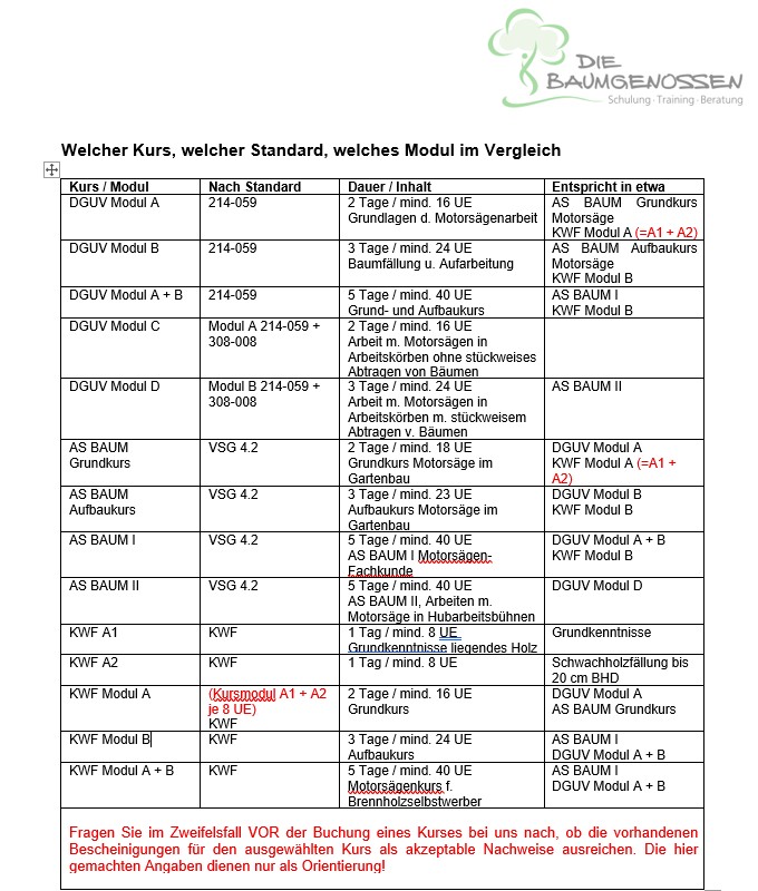 Deswegen gibt es u.a. nur drei Kursstandards für den Umgang mit der Motorsäge, die wir als akkreditierte Schule der SVLFG als Zulassungsvoraussetzung für unsere Kurse akzeptieren dürfen. Die Vorgaben für diese Standards sind praktisch deckungsgleich, eine gegenseitige Anerkennung ist in der Praxis gegeben; die erfolgreiche Teilnahme am entsprechenden Kurs (z.B. SKT-B, AS BAUM I, AS BAUM II) oder den entsprechenden Modulen anderer Träger ist natürlich vorausgesetzt.